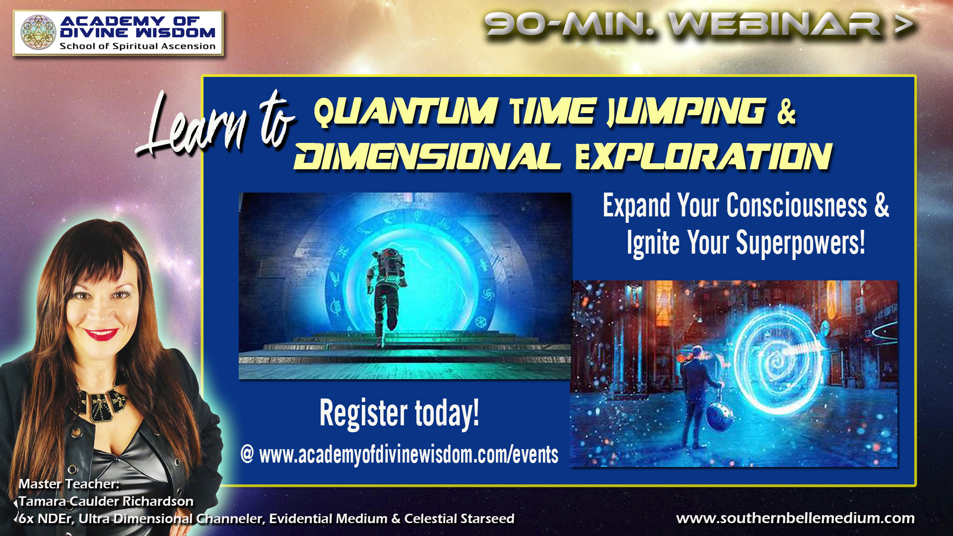 Learn how to Time Jump and explore other dimensions, and to alter future events to a positive outcome with instructor Tamara Caulder Richardson, known as the Southern Belle Medium which is 6x Near-Death & UFO Experiencer, Evidential Psychic Medium, Christ & Ultra Dimensional Channeler. This will also include live Q&A and a guided quantum meditation. Register today and open your astral bodies and superpowers! ONLY $44