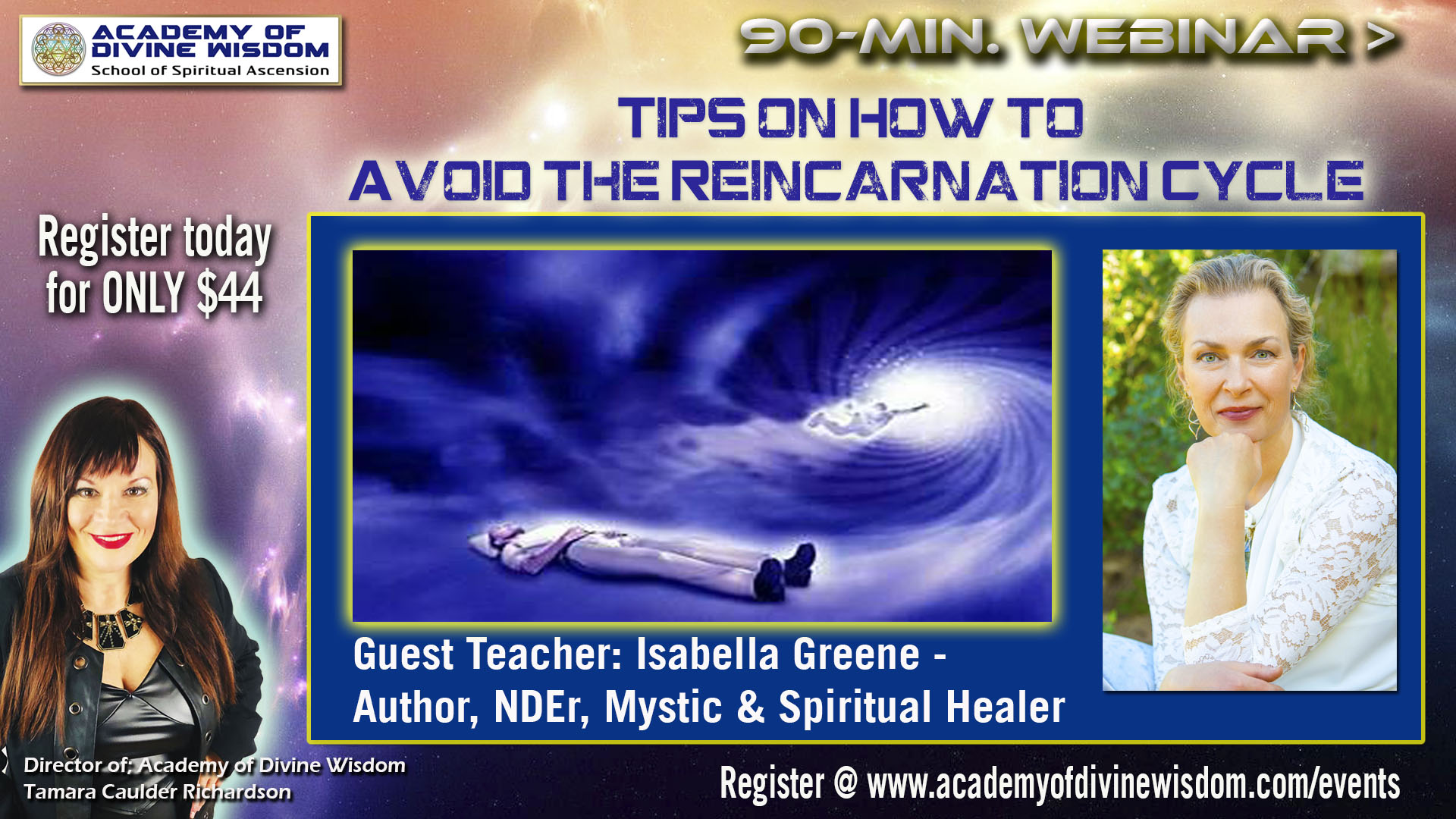 Join guest presenter, Isabella Greene, Author of, LEAVING THE TRAP: How to Exit Reincarnation Cycle. In this webinar, Isabella will be giving us hands-on tips on how to avoid getting distracted & sucked into false lights, or being talked into more earth incarnations by astral handlers, but to be selective as to where your soul might want to go next. Be empowered & find out you are in control of your soul's journey!